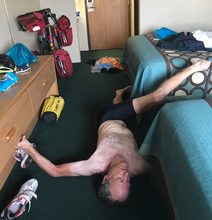I am writing this in a motel that’s a nice refuge from tonight’s expected drizzle, something that we haven’t seen for a month. Mark is the good one, doing his yoga.