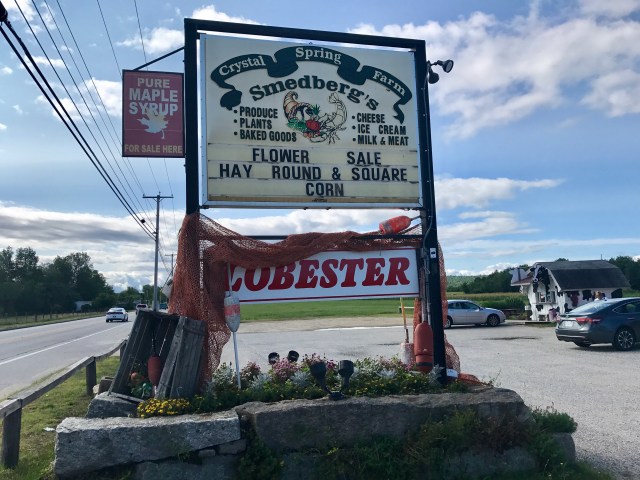 We finished our ride on a day of bright sun and wind at our back. The sixty miles from Bethel to home went by in time to let us stop at the farm stand in Gray to pick up corn and cucumbers for lunch. Though we were traveling workaday Route 26, we delighted in every landmark, including my favorite misspelling.