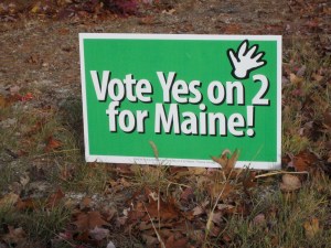 This sign sprouted first, months ago: a white hand waves jauntily over “Vote Yes on 2 for Maine.” At first I thought the sign was cute and friendly, harking back to an earlier time when there might have been only one question on the ballot, and everyone knew what the question was. But I had no idea what this sign was advocating. A referendum to require white gloves at proms? For friendly waves? For latex-free physicals? For monthly Halloween? Whatever it was, whoever supports it, they must think we voters are blind, because they put up the signs up in rows, like sale signs on windshields in a used car lot. It turns out that Question 2 is an effort by Penn National Gaming to build a casino in rural Maine. Maybe there’s no way to capture the benefits on a 12×20 inch sign. Or maybe there aren’t any.